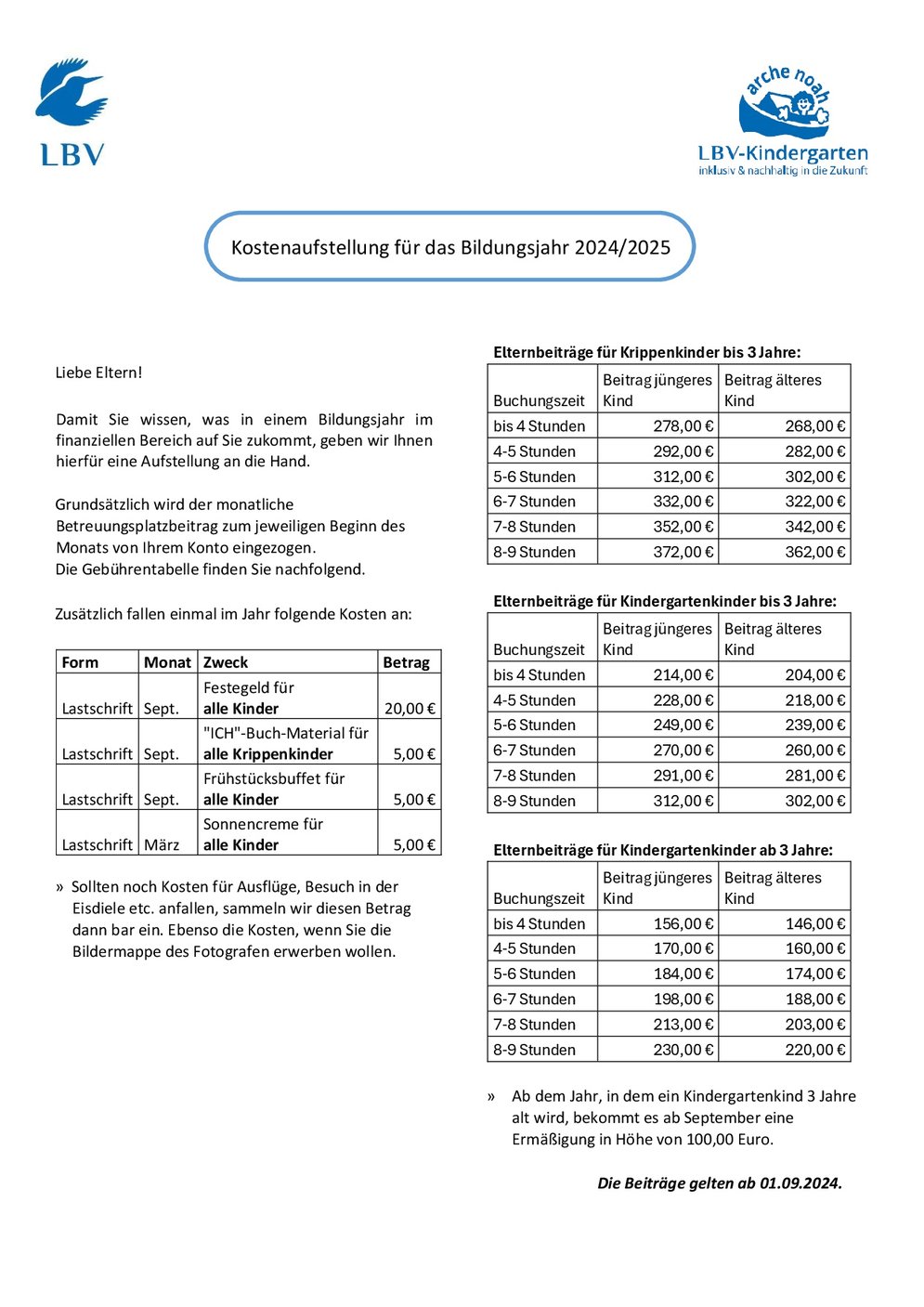 Der Kindergarten hat während der Weihnachtsferien und die ersten drei Wochen im August geschlossen. Ebenso am Tag der Betriebsversammlung des LBV und in der zweiten Pfingstferien-Woche. Jährlich erhalten alle Familien einen Jahresplan mit den genauen Schließzeiten und weiteren Daten zum Vormerken.